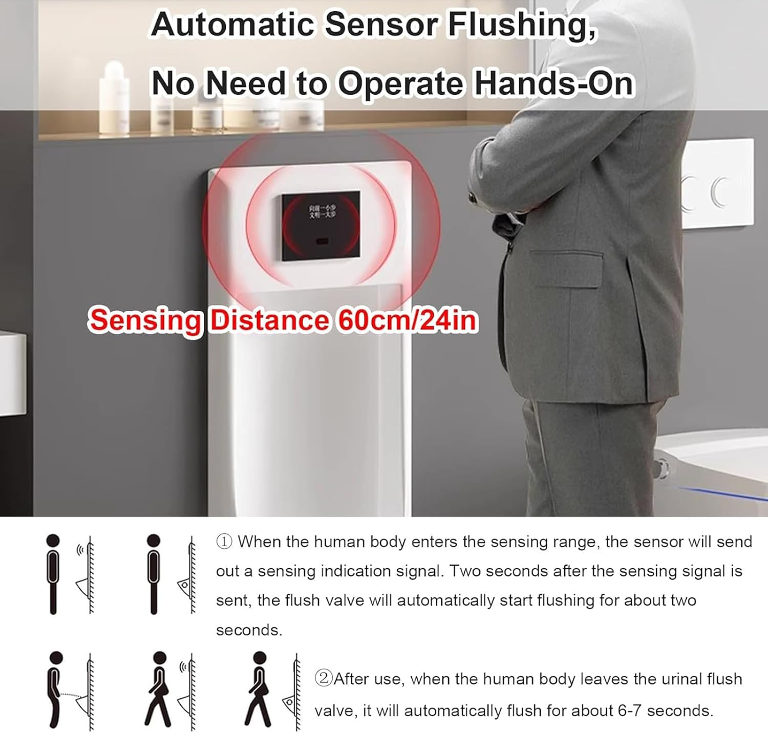 Are you still worried about public restroom hygiene? Want a convenient and hygienic toileting experience at home? This smart sensor ceramic urinal is your ideal choice! It combines intelligence, hygiene, water conservation, and aesthetics, bringing you a brand new bathroom experience.Suitable for bathrooms, hotels, shopping malls, bars, schools, and other places.Product Specifications:Material: CeramicSensor Method: InfraredSensor Distance: 24 inchesFlush Type: WaterfallMounting Method: Built-in (Refer to the dimensions shown in the image for installation dimensions)Inlet Pipe Size: 13mm (1/2 in)Drain Pipe Size: 2 inDimensions: 13 in wide, 27.5 in high, 1.2 in thickPackaging Contents:Urinal × 1Full Set of Installation AccessoriesInstallation Instructions